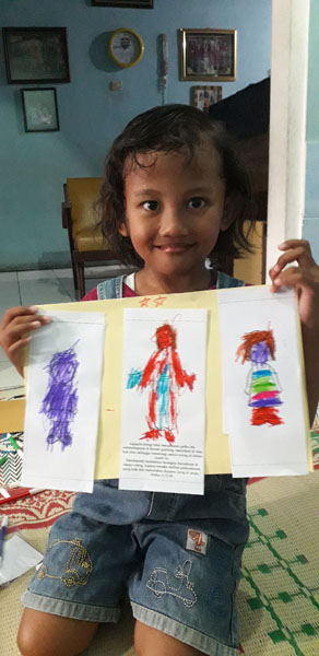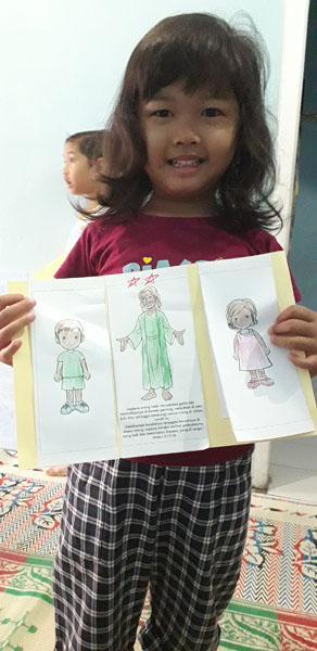 Kegiatan selanjutnya yang ditunggu anak-anak yaitu menempel dan mewarnai prakarya sesuai dengan tema. Anak-anak diberi kertas tempel dan 5 gambar, yaitu gambar Yesus, anak laki-laki, anak perempuan, gambar garam, dan gambar lampu sebagai lambang terang. Dengan asiknya anak-anak melakukan kegiatan menempel dan mewarnai dan diakhir waktu mereka menunjukkan hasil karyanya dengan gembira. Kegiatan diakhiri dengan peneguhan untuk berbuat baik selalu dan doa penutup.(LJS)