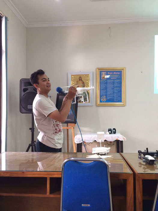 Lalu bapak Agustinus Suseno selaku ketua KOMSOS Kevikepan DIY memberikan sambutan. Harapan pak Seno agar semua peserta pertemuan pada siang hari ini bisa menikmati pelatihan. Memanfaatkan kemajuan dunia IT untuk menjadi pewarta di tengah-tengah Gereja Katolik. Yang paling penting, buang jauh ketakutan kalau-kalau drone rusak oleh peserta, anak muda harus berani berkarya.