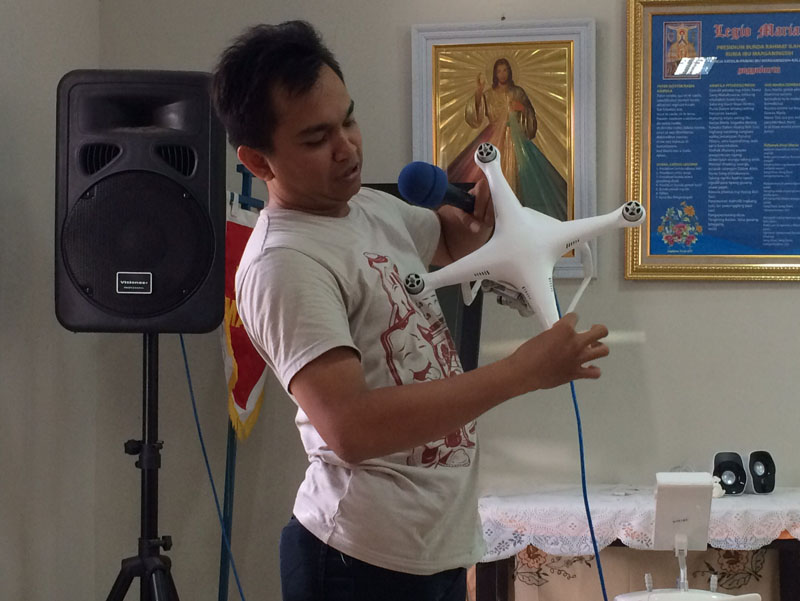 Pelatih kami siang ini sangat spesial yaitu Mas Wawan, Mas Tatang & Mas Deddy (Paroki Santa Perawan Maria Tak Bercela Nanggulan, Kulon Progo), serta Mas Adrian (Paroki Santo Petrus & Paulus Minomartani, Sleman). Mengenai drone, mereka berempat jagonya !